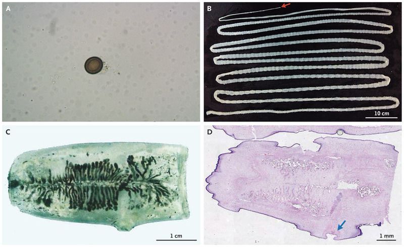 A 38-year-old man presented with worsening abdominal pain, vomiting, anorexia, generalized weakness, and weight loss that had begun 3 days earlier. He had a history of eating raw beef. During the previous 2 years, he had been seen by several different doctors and had been given clinical treatment for stomachache, abdominal pain, and chronic anemia. Physical examination was largely unremarkable. Microscopic examination of stool showed an embryonated egg containing an oncosphere (Panel A). The patient was treated with praziquantel, administered orally at a dose of 60 mg per kilogram of body weight; approximately 40 minutes later, he received mannitol as a catharsis drug, administered orally at a dose of 300 ml in 20% aqueous solution. Two and one half hours after the administration of mannitol, the patient discharged a tapeworm that measured 6.2 m excluding the scolex (Panel B, arrow). A gravid proglottid was identified, with at least 23 lateral uterine branches on each side (Panel C) and a distinct genital pore containing a vaginal sphincter (Panel D, arrow). The patient received a diagnosis of Taenia saginata (beef tapeworm) infection. Humans become infected with T. saginata by ingesting cysticerci during consumption of raw or inadequately cooked beef. The tapeworm attaches to the small intestine and can grow to be several meters in length. Humans are the only definitive hosts. At a follow-up visit 3 months later, the patient was asymptomatic, with recovery of appetite and weight.