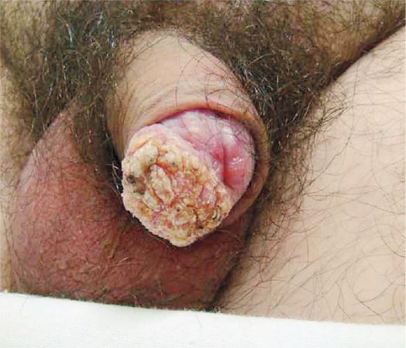 A 54-year-old man presented with a polypoid mass involving the right side of the penis glans, which had developed over a period of approximately 8 months. The lesion was itchy with purulent secretions. It was associated with a swollen right inguinal lymph node and a weight loss of 9 kg over the previous 6 months. The patient’s sexual history was notable for unprotected intercourse with multiple partners. Serologic tests were negative for various sexually transmitted infections, including human immunodeficiency virus infection. Biopsies of both the lesion and the lymph node were performed, and a diagnosis of squamous-cell carcinoma with presence of human papillomavirus (HPV) serotype 18 was made. Surgery (excision of the lesion, with a local flap used for coverage of the soft-tissue defect) was performed with satisfactory results. HPV is a known cause of cervical cancer in women. HPV infection can also affect men and can cause penile cancer, although its prevalence is lower than that of cervical cancer among women. Primary prevention, education, and vaccination are important to reduce the occurrence of HPV infection and associated cancers.