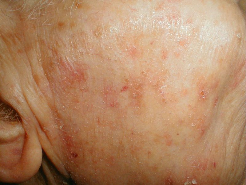 Actinic keratosis It is most common on the face, lips, ears, back of hands, forearms, scalp, and neck. The rough, scaly skin patch enlarges slowly and usually causes no other signs or symptoms. A lesion may take years to develop.