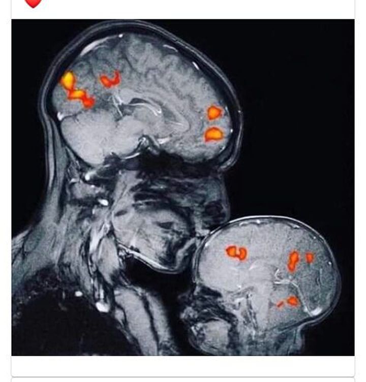 MRI of mother kissing her baby. Her kiss has caused a chemical reaction in her baby's brain that released a burst of oxytocin (a hormone that produces feelings of affection and attachment)