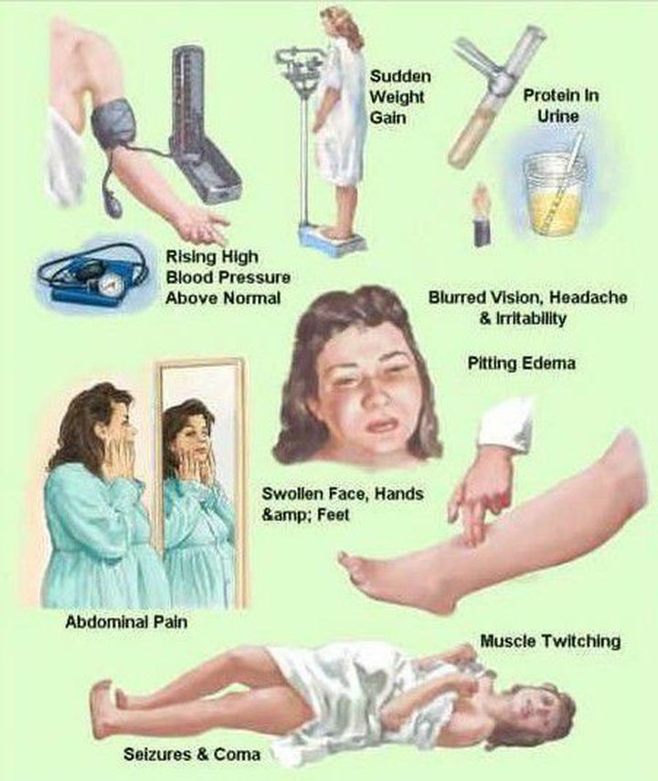 Preeclampsia is a condition that begins during pregnancy, usually after the 20th week. However, the symptoms and signs of preeclampsia may persist after delivery, and rarely the condition might not be recognized until after the baby is born. A woman with preeclampsia develops high blood pressure and usually protein in her urine, and she often has swelling (edema) of the legs, hands, face, or entire body. When preeclampsia becomes severe, it can cause dangerous complications for the mother and the fetus. One of these complications is eclampsia, the term used when seizures develop in a woman with severe preeclampsia. Another concern is the higher risk of stroke during pregnancy and after delivery. The best hypothesis is that preeclampsia occurs when the placenta does not anchor itself as deeply as expected within the wall of the uterus during the first trimester. What causes this abnormal anchoring is unclear, but it may be influenced by the mother's or father's genes or the mother's immune system, and medical conditions the mother may have, such as diabetes or high blood pressure. Eclampsia and, especially, death from preeclampsia are very rare in well-resourced countries like the United States. However, even with the best care, preeclampsia is a leading cause of illness for mothers and newborns
