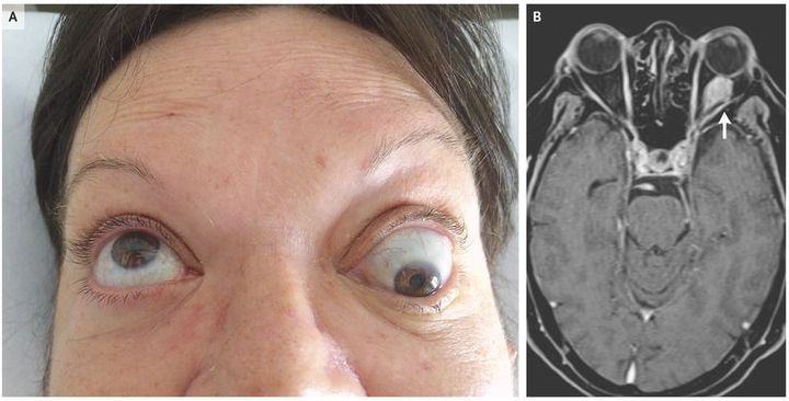 A 60-year-old woman presented to the emergency department with a 2-month history of blurry vision in her left eye. Three years earlier, she had received a diagnosis of estrogen receptor– and progesterone receptor–positive, human epidermal growth factor receptor 2 (HER2)–negative invasive ductal carcinoma of the right breast. She had undergone lumpectomy, axillary-node dissection, and adjuvant radiation therapy, followed by therapy with tamoxifen at a dose of 20 mg daily. At the time of the current presentation, examination revealed proptosis and an inability to look up with the left eye (Panel A and video). There was no axillary lymphadenopathy, and no masses were noted on breast examination. Magnetic resonance imaging of the head revealed a mass, measuring 19 mm by 15 mm by 17 mm, involving the inferior rectus muscle of the left eye (Panel B, arrow). Biopsy revealed metastasis of hormone receptor–positive, HER2-negative breast cancer. The patient began treatment with fulvestrant and palbociclib, followed by radiation therapy. At follow-up 6 months after the initiation of treatment, she had resolution of the proptosis and blurry vision; imaging showed that the mass was no longer present and there were no new sites of metastatic disease.
