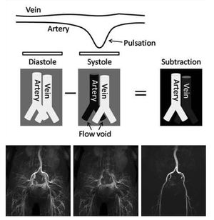 ECG-gated FSE angiography (NATIVE-SPACE, Inhance Deltaflow, TRANCE, FBI) produces a bright-blood angiographic image (right) by subtracting the image obtained during systole (middle) from the image obtained during diastole (left) to remove background noise and signals from veins. Signals from arteries with fast flow are voided on the image obtained during systole, while signals from arteries and veins with slow flow remain at high intensity on an image obtained during diastole. #MRI #NCE_MRA