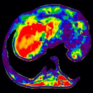 #MR_Elastography (MRE) provides a new MRI-based biomarker for characterizing tissue non-invasively. #MRE obtains information about the stiffness of tissue by assessing the propagation of mechanical waves through the tissue with a special magnetic resonance imaging technique. MRE is being used clinically for the assessment of patients with chronic liver diseases and is emerging as a safe, reliable, and non-invasive alternative to liver biopsy for staging hepatic fibrosis. MRE is also being investigated for application to pathologies of other organs including the brain, breast, blood vessels, heart, kidneys, lungs, and skeletal muscle. This image is an Elastogram, which calculated from the wave image and provides reliable data about tissue stiffness. #MRI #MRI_biomarker