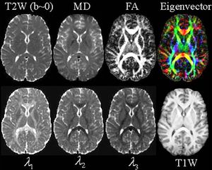 Quantitative maps from a #DTI experiment. The images include the T2-weighted (T2W) “reference” (or b=0) image from DTI data; the mean diffusivity (MD - note similar contrast to T2W image with CSF appearing hyperintense); fractional anisotropy (FA - hyperintense in white matter); the major eigenvector direction indicated by color (red = R/L, green = A/P, blue = S/I) weighted by the FA (note that specific tract groups can be readily identified); the major, medium and minor eigenvectors (11, 12, and 13, respectively). A conventional T1-weighted (from a 3D MP-RAGE) at the same anatomical location is also displayed. #MRI
