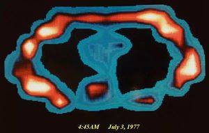 On July 3, 1977, Raymond Damadian and coworkers, Minkoff and Goldsmith, produces the first MR image of the human body, on a 0.05 Tesla MR scanner, utilizing voxel method of patent. This is the first MR image of the human body, a cross-section of Minkoff's chest near the level of T7/8.