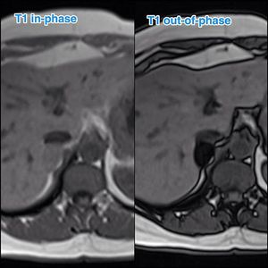 Right adrenal adenoma. The signal drops in the out of phase imaging within the adrenal lesion signifies presence of intracellular fat.