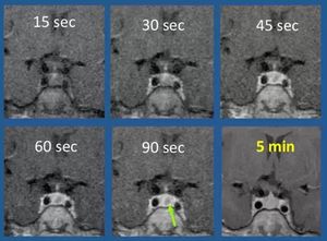 Dynamic contrast-enhanced (DCE) imaging is a method for acquiring a series of MR images in rapid succession following the administration of contrast. Similar to CT, viewing the "wash-in" and "wash-out" of contrast on MRI may improve the detection and delineation of tumors and vascular lesions. The technique is also called "keyhole" imaging, deriving from the k-space representation of the sequence, which resembles a slot or keyhole. The middle portion of k-space (the keyhole) contains low spatial frequency information - overall brightness or darkness and general shapes within the image. The peripheral portions of k-space contain high spatial frequency information (edges and details). When gadolinium contrast passes through the anatomy of interest, only the general brightness or darkness change significantly. This dynamic information can be obtained from sampling the center of k-space only. In the basic keyhole method, an initial pre-contrast reference image is obtained at full resolution using the complete set of k-space data. Following contrast injection, the center of k-space is repeatedly sampled every few seconds while the periphery is only sampled occasionally. Because only the central keyhole data changes during a dynamic acquisition, an appreciable savings in scan time can be achieved by not rescanning the periphery. Final images at full resolution are then reconstructed using the peripheral k-space data from the reference data set and central k-space data from the keyhole sets. A variety of more sophisticated DCE techniques exist including modeling of perfusion and permeability. Image shows a contrast-enhanced pituitary MRI using keyhole technique. Note left sided microadenoma (arrow) seen on dynamic portion of study, invisible at 5 min. #MRI #DCE #keyhole_imaging
