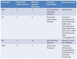Diffusion MRI (or dMRI) is a MRI method which came into existence in 1985. It allows the mapping of the diffusion process of water molecules in biological tissues, in vivo and non-invasively. Molecular diffusion in tissues is not free, but reflects interactions with many obstacles, such as macromolecules, fibers, and membranes. Water molecule diffusion patterns can therefore reveal microscopic details about tissue architecture, either normal or in a diseased state. Table provides information about the different diffusion models.