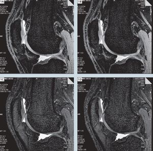 Sagittal water selective 3D DESS imaging of the knee (TR/TE 14.1/5 ms) at various flip angles (1A = 25°, 1B = 45°, 1C = 60°, 1D = 90°). With the flip angle of 60° there is highest signal intensity of synovial fluid with highest contrast-to-noise ratio of the cartilage (Thakkar et. al, 2011).
