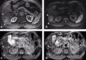 Intravoxel incoherent motion (IVIM) imaging is a concept and a method initially introduced and developed by Le Bihan et al. to quantitatively assess all the microscopic translational motions that could contribute to the signal acquired with diffusion MRI. In biological tissues, these motions essentially are molecular diffusion of water and microcirculation of blood in the capillary network (perfusion). The concept introduced by D. Le Bihan is that water flowing in randomly oriented capillaries (at the voxel level) mimics a random walk ("pseudo-diffusion"). According to IVIM theory, the fast component of diffusion (represented by D*) is related to microperfusion (mainly on low b values, 0-100 s/mm2), whereas the slow component (represented by D) is linked to pure molecular diffusion. Owing to this bi-compartmental model, the signal decay of IVIM DWI was described using a bi-exponential model. Using IVIM-based analysis, it is possible to derive quantitative indexes that describe conventional ADC (ADCtotal), tissue water diffusivity (pure diffusion/ D), tissue perfusion (pseudodiffusion coefficient/ D*), and the perfusion fraction of tissues (f), which can also be displayed as parametric maps. Because there are four fitted parameters, a minimum of four b values are needed to characterize bi-exponential signal attenuation, though this choice is not recommended. A larger number of b values would provide more data support for the estimates and would enable parameter uncertainties to be evaluated, which is not possible with four b values. IVIM model can be used on clinical applications in the liver, pancreas, prostate and other well-perfused body organs. Figure shows a 3.2 cm surgically confirmed HCC in 59-year-old man. The mass (arrowheads) showed heterogeneous enhancement during arterial phase (a) and high signal intensity on DWI (b factor, 800 sec/mm2) (b). The tumor showed a slightly lower ADC value (arrowheads) than surrounding liver parenchyma on ADC map (c). True D was obviously lower (arrowheads) than liver parenchyma on D map (d) (Yoon et al. 2013.