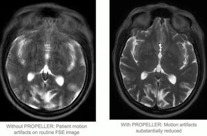 How does PROPELLER (BLADE, MultiVane) reduce motion artifacts? PROPELLER technique has the advantage of central k-space oversampling, so that image artifacts (motion, flow etc) are greatly reduced.