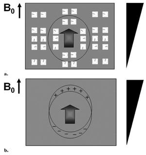 Schematics show the mechanism that causes metal-related artifacts at MR imaging. (a) The spins in the main magnetic field predictably rotate at the same frequency.When the frequency encoding gradient is applied, the Larmor frequencies of the spins change along the gradient direction. The spins at locations of higher magnetic field strength (upper part of the triangle) rotate at higher frequencies. When a metallic object is placed in the region of interest (arrow inside the circle), the spins near the object rotate with higher frequency than those that are distant from it. (b) The region of interest near the metallic object is encoded as if it were at a higher gradient location (upper circle) than it actually is. The signal around the region of interest is summed at a higher gradient location (+) and subtracted at a lower one (-). The result is geometric distortion of the object (Lee et al., 2007).