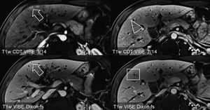 CAIPIRINHA-Dixon-TWIST (CDT) Volume-Interpolated Breath-Hold Examination (VIBE) is a new MR technique for fast Time-Resolved dynamic 3-Dimensional (3D) Imaging of the abdomen with high spatial resolution. The CDT-VIBE allows robust, dynamic contrast-enhanced imaging of the upper abdomen with unprecedentedly high temporospatial resolution. The technique seems suitable for the detection and characterization of focal abdominal lesions such as liver and pancreatic masses. The CDT-VIBE may also prove useful for the acquisition of perfusion measurements in pelvic, breast, and extremity imaging. Figure: Hypervascular hepatic lesions in a 73-year-old man with pancreatic cancer (arrow and arrowhead) depicted clearly with CDT-VIBE. With venous phase VIBE imaging, only the larger metastasis in segment 4b of the liver can be appreciated (arrow, lower row), whereas the second lesion cannot be detected (box) (Michaely et al., 2013).