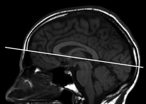 Orientation of axial oblique sequences for MR imaging of the brain. Orientation of axial oblique sequences should be along the subcallosal line as indicated by the solid line.