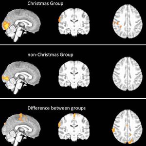 We can use fMRI brain scans to detect our levels of Christmas Spirit, according to a new study in the BMJ. fMRI scans measure blood flow and blood oxygenation in specific areas of the brain in response to neural activity. These scans can map out pathways involved in particular mental processes—perfect for detecting brain activity during peak Christmas Spirit. In this particular study, researchers hooked 20 volunteers up to fMRI (“no eggnog or gingerbread was consumed before the scans,” the researchers note) and showed them Christmas-themed images. Afterwards, the participants answered a survey about their Christmas memories and traditions. The results highlighted five clusters of activity that differed strongly between participants who celebrated Christmas and those who did not. Specifically, the scientists found increased brain activity near the frontal premotor cortex, somatosensory cortex and the parietal lobule in people who celebrated Christmas—in other words, a functional Christmas network woven into the human brain.