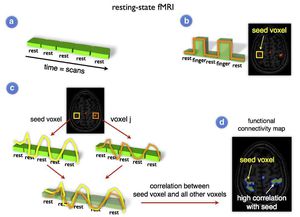 Resting-State functional Magnetic Resonance Imaging (RS-fMRI) studies are focused on measuring the correlation between spontaneous activation patterns of brain regions. Within a resting-state experiment, subjects are placed into the scanner and asked to close their eyes and to think of nothing in particular, without falling asleep. Similar to conventional task-related fMRI, the BOLD fMRI signal is measured throughout the experiment (panel a). Conventional task-dependent fMRI can be used to select a seed region of interest (panel b). To examine the level of functional connectivity between the selected seed voxel i and a second brain region j (for example a region in the contralateral motor cortex), the resting-state time-series of the seed voxel is correlated with the resting-state time-series of region j (panel c). A high correlation between the time-series of voxel i and voxel j is reflecting a high level of functional connectivity between these regions. Furthermore, to map out all functional connections of the selected seed region, the time-series of the seed voxel i can be correlated with the time-series of all other voxels in the brain, resulting in a functional connectivity map that reflects the regions that show a high level of functional connectivity with the selected seed region (panel d) (M.P. van den Heuvel, H.E. Hulshoff Pol, 2010)