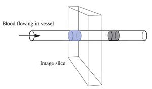The blood vessel is shown crossing through the imaging slice. When the sequence is repeated, the previously excited blood (coloured grey) has moved on and the bolus within the slice (coloured blue) has fully relaxed magnetization M0.