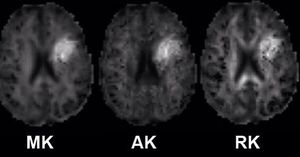 Diffusion Kurtosis Imaging (DKI) is a method for quantifying the degree to which water diffusion in biological tissues is non Gaussian. Since tissue structure is responsible for the deviation of water diffusion from the Gaussian behavior typically observed in homogeneous solutions, this method provides a specific measure of tissue structure, such as cellular compartments and membranes. We can distinguish the anisotropic Gaussian distribution with an extend form of DTI. DKI protocols differ from DTI protocols in requiring at least 3 b-values (as compared to 2 b-values for DTI) and at least 15 independent diffusion gradient directions (as compared to 6 for DTI). Typical protocols for brain have b-values of 0, 1000, 2000 s/mm2 (the higher b value the better as long as you have adequate SNR) with 30 diffusion directions. Image post-processing requires the use of specialized algorithms which can generate a set of kurtosis (mean, axial, radial) parametric maps.