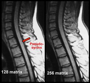Truncation artifacts (also known as Gibbs, ringing, or spectral leakage artifacts) typically appear as multiple fine parallel lines immediately adjacent to high-contrast interfaces due to truncation (shortening) of Fourier series approximation. These artifacts are particularly problematic in spinal imaging, in which they may artifactually widen or narrow the cord or mimic a syrinx.