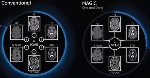 GE SIGNA Pioneer’s MAGiC: one-and-done MRI designed to acquire images in as little as one-third the time (http://gecommunity.on.arena.ne.jp/MAGiC/tetr.html) For the first time ever with MAGiC, clinicians will have the ability to generate multiple image contrasts in a single MRI scan including T1-W, T2-W, STIR, T1-W FLAIR, T2-W FLAIR and PD-W images of the brain in a single acquisition. Another innovation is that the contrast of images can be changed even after completing the scan by simply moving the cursor on the MAGiC interface to change acquisition parameters such as TR, TE and TI. MAGiC enables one scan that can do the work of many and can be processed in many ways – an industry first. MAGiC, the result of a collaboration with SyntheticMR AB, is one-and-done imaging that could provide significant productivity benefits. With MAGiC, a single scan that delivers six contrasts can be completed in as little as one-third the total time taken to acquire each contrast separately using conventional techniques. This time saved could potentially allow clinicians to scan one more patient per hour, every hour of every day.