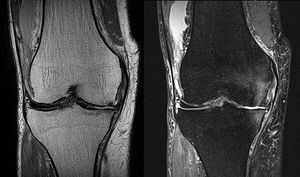 Fat suppression is an important technique in musculoskeletal MR imaging to improve the visualization of bone marrow lesions. Figure: Coronal PD-W TSE (left) and fat suppressed PD-W TSE (right) MR images of the right knee. Fat suppressed PD-W image can visualize the bone marrow edema on the medial condyle of femur and tibia, while no lesion is highlighted on the PD-W image. Image dataset acquired at 1.5 Tesla. Reference: Images courtesy of Bac Nguyen