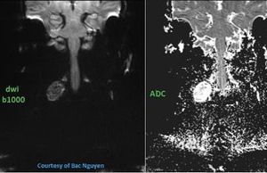 Diffusion-weighted imaging (DWI) is used to evaluate random, microscopic water motion within tissue, well known as Brownian motion. RESOLVE (figure) can be applied in head and neck MR Imaging for several clinical indications, providing higher image quality with less distortions and image blurring compared to SS-EPI, in reasonable acquisition times. Figure b1000 (left) & ADC map (right). RESOLVE allows the detection and characterization of head and neck tumor. Images courtesy of Bac Nguyen.
