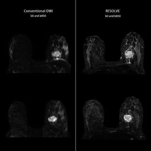RESOLVE is a revolutionary new approach for obtaining high-quality, high-resolution DWI images even in body regions strongly affected by susceptibility artifacts, as breast. It is largely free of distortions and delivers sharp imaging at higher spatial resolution. Fig conventional SS-EPI DWI (left) and multi-shot RESOLVE (right). RESOLVE provides higher image quality with less distortions. Therefore, breast carcinoma is better depicted on RESOLVE imaging.
