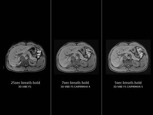 Caipirinha is Brazil's national cocktail, made from sugar cane liqueur (cachaça), sugar, ice, and lime. It received some recent increased world-wide recognition as the result of news coverage of the 2014 FIFA World Cup. In MRI, CAIPIRINHA (Controlled Aliasing in Parallel Imaging Results in Higher Acceleration) is a data acquisition technique, offered by Siemens, that significantly reduces breath-holds without affecting image resolution, coverage, or contrast. It can be combined with 3D T1 VIBE (allows for SPAIR and spectral FS) or 3D Dixon (Four contrasts: in phase, opposed phase, fat, and water) in a single short breath-hold. CAIPIRINHA uses a group unique k-space sampling patterns to reduce pixel aliasing and overlap on reconstructed images. Acquired points in k-space are shifted from one another by applying additional offsets to the phase-encoding gradient tables.