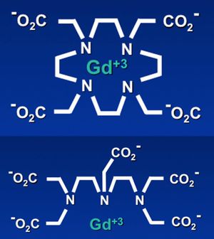 Structurally, gadolinium-containing contrast agents can be divided into two groups based on the type of ligand. Macrocyclic agents (upper) form a cage-like ligand structure with the ion trapped in a preformed central cavity. Linear agents (bottom) have an elongated organic molecular ligand that wraps around the ion. Both linear and macrocyclic agents can either be ionic or non-ionic.