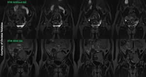 STIR stands for Short-TI Inversion Recovery and is typically used to null the signal from fat. STIR sequence is generally uniform and relatively independent of magnetic field inhomogeneities. Unfortunately, STIR cannot be used as a fat suppression technique post-gadolinium (figure). STIR does not specifically suppress fat; it only suppresses tissues with (short) T1 values in the range of fat (200-300 ms). Thus gadolinium-containing tissues (like bladder, uterine fibroid; bottom row) with similar relaxation times will also be suppressed.