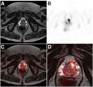 The combination of F-18 choline PET and multiparametric MRI (mpMRI) shows promise for detecting prostate cancer, according to a study in the July issue of the Journal of Nuclear Medicine. T2-weighted fast spin-echo MRI (A), F-18 choline PET (B), and fused PET/MRI (C) show a 0.68-cm3 left anterior transitional zone lesion that was confirmed on targeted biopsy. A magnified view of PET/MRI (D) shows a target lesion (magenta) and respective mirrored (blue) background volumes of interest. Image courtesy of JNM.