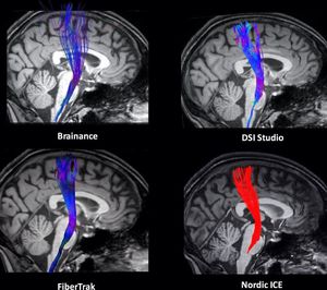 Reconstruction of the left corticospinal tract overlaid on a high-resolution T1-3D sagittal slice using Brainance (upper left); DSI studio (upper right); Philips FiberTrak (bottom left); NordicICE (bottom right). F. Christidi et al. / European Journal of Radiology Open 3 (2016) 153–161