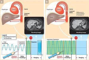 Gadoxetate disodium (Gd-EOB-DTPA, Primovist®/Eovist®, Bayer HealthCare Pharmaceuticals, Berlin, Germany) is a liver-specific magnetic resonance imaging (MRI) contrast agent. Several studies have described arterial phase image degradation for gadoxetate-enhanced liver MRI. These motion-related artefacts were attributed to acute but transient episodes of dyspnoea in response to gadoxetate administration and isolated to the arterial phase (Transient Severe Respiratory Motion Artefact, TSM). Gutzeit et al. 2015, propose the use of a modified, extended breathing command, which significantly improves the arterial phase T1-weighted MR image quality scores and reduces severe and extensive respiratory motion artefacts at gadoxetate-enhanced liver MRI. Fig. Traditional (A) and modified breathing command (B). In the traditional breathing command, the patient breathes freely before and after contrast injection until he is instructed to breathe in and breathe out, and to hold the breath during the acquisition period. In the modified breathing method, the patient is guided to continuously breathe in and out four times in a row before contrast media injection and to continue in this rhythm during bolus tracking until he is instructed to hold his breath for the image acquisition. This example shows the same patient in an intraindividual comparison who had been investigated with untrained technicians (left hand side) and after training of technicians (right hand side) several weeks later.