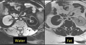 Although generally better than CHESS/Fat-Sat sequences, modern Dixon methods still have their limitations, particularly in highly inhomogeneous areas like the neck and around metal hardware. A curious artifact occasionally occurs wherein the mathematical computations will converge to the wrong substance, producing a fat-only image when a water-only image is desired. An interesting example of this so-called "fat-water swap" is shown below. Fig. Failure of local convergence in IDEAL sequence with fat-water swap. The normal left kidney has been mistakenly identified as composed of fat rather than water.