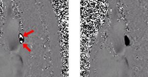 VENC stands for velocity encoding, a parameter that must be specified before performing a phase-contrast (PC) MRI or MRA study. VENC, measured in cm/sec, should be chosen to encompass the highest velocities likely to be encountered within the vessel of interest. If VENC is set to 50 cm/sec, for example, flows in the range of ±50 cm/sec can be accurately represented by a set of phase shifts spanning from −180° to +180°. If VENC is picked too low, velocity aliasing may occur with faster flows not being appropriately represented. Fig (left) PC study of pulmonary artery with VENC set too low (15 cm/sec). Note velocity aliasing (white areas) which appears to be flow in the wrong direction. (right) PC study of pulmonary artery with VENC set properly (30 cm/sec). The vessel is properly displayed as black with velocity aliasing no longer apparent.