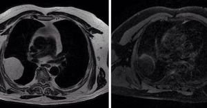 Because of the presence of fat, the lesion appears with high signal intensity on T2-weighted image (due to J-coupling effects) and with low signal intensity on fat suppressed T1-weighted image. via MDCT