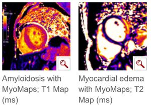 MyoMaps offers the possibility of acquiring pixel-based quantitative myocardial tissue characteristics. Robustly, efficiently, and on the fly. MyoMaps has the clinical potential to help you assess myocardial pathologies with new information, such as: - Detection of global, diffuse and sometimes subtle myocardial pathologies (T1 Map). - Depiction of cardiac edema (T2 Map). - Detection of iron overload, guiding cardiovascular therapy - starting earlier and more efficiently (T2* Map).