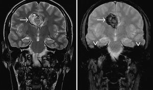 Cerebral cavernous venous malformations, commonly known as cavernous haemangioma or cavernoma, are common cerebral vascular malformations, usually with characteristic appearances on MRI. MRI is the modality of choice, demonstrating a characteristic “popcorn” or "berry" appearance with a rim of signal loss due to hemosiderin, which demonstrates prominent blooming on susceptibility weighted sequences. T1 and T2 signal is varied internally depending on the age of the blood produces and small fluid-fluid levels may be evident. Gradient echo or T2* sequences are able to delineate these lesions better than T1 or T2 weighted images. In patients with familial or multiple cavernous angiomas GRE T2* sequences are very important in identifying the number of lesions missed by conventional Spin echo sequences. Note the susceptibility artifact (arrowhead) on T2*-w (right image) due to local inhomogeneities.