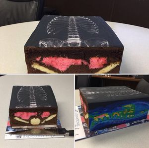 Here's the winner of ESR's International Day of Radiology (IDoR) cake competition! Congratulations to its creators, Dr. Scott Harter and his daughter, Christina Harter-Felszeghy, who win free registration for one person for ECR 2017 - European Congress of Radiology! It's a chocolate and vanilla cake with chocolate ganache frosting. The top has frosting to look like a scout film of the abdomen and pelvis. Inside the cake are lungs, heart, liver, spleen, kidneys, g.i. gallbladder and pancreas - when you cut the cake it shows a cross section of the abdomen! #radiology