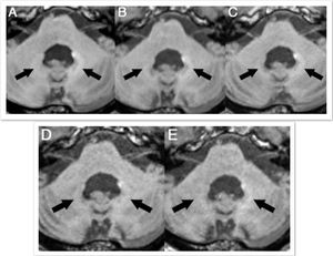 "Post-MRI signals disappear with macrocyclic gadolinium" Axial MR images of a patient before (A) and after nine (B), 17 (C), 29 (D), and 41 (E) administrations of gadobutrol and gadoterate meglumine. Pre-existing hyperintensities in the dentate nucleus (most likely related to prior linear GBCA injection) are visible in all images. There is a slight decrease in hyperintensities between the baseline MRI and the MRI after 41 injections of macrocyclic GBCAs. Images courtesy of Radiology.