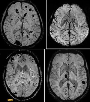 Susceptibility-weighted imaging (SWI) is a neuroimaging technique, which uses tissues magnetic susceptibility differences to generate a unique contrast, different from that of proton density (PD), T1, T2, and T2*. SWI uses a fully flow/velocity compensated, RF spoiled, high-resolution, three-dimensional (3D) gradient recalled echo (GRE) scan. Both the magnitude and phase images are saved. The phase image is high pass (HP) filtered to remove unwanted artifacts (background field inhomogeneities caused by air-tissue interfaces and main magnetic field effects). The magnitude image is then combined with the HP filtered phase image to create an enhanced contrast magnitude image referred to as the susceptibility weighted image (SWI). It is also common to create minimum intensity projections (minIP) over 8 to 10 mm to better visualize vein connectivity.
