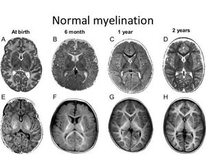 Image shows the normal myelination. Upper row: axial T2-w Lower row: axial T1-w