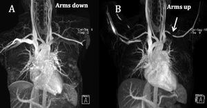 Thoracic Outlet Syndrome (TOS) refers to the constellation of symptoms due to compression of the brachial plexus and subclavian vessels as they traverse the thoracic outlet between the anterior and middle scalene muscles. MRA is the preferred imaging modality for TOS because of its better soft tissue resolution and tissue characterization capability without the use of radiation. Upper extremity abduction is the standard practice and is shown to be effective as a positional maneuver for diagnosis of TOS. Diameter change by 430% for subclavian artery and by 450% for subclavian vein between the neutral and abducted extremity positions is considered significant for the diagnosis of TOS (fig.) Figure Coronal MIP MRA image with arms down (A) shows normal upper extremity inflow arteries. Coronal MIP MRA with abduction of the arms (B) shows severe stenosis of the left subclavian artery (arrow) suggesting arterial thoracic outlet syndrome (P. Nagpal et al. 2016)
