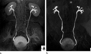 (a) On a coronal MIP image from excretory MR urographic data obtained with a 3D interpolated fat-suppressed gradient-echo sequence (VIBE/THRIVE/LAVA) during breath holding, soft-tissue suppression is minimized owing to the use of a relatively low flip angle of 12°. (b) Coronal MIP image from excretory MR urographic data obtained with a 3D gradient-echo MR angiographic sequence shows improved background tissue suppression due in part to the use of a higher flip angle of 40° (Leyendecker et al 2008)