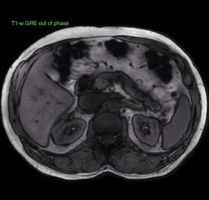 Characteristic chemical shift artifact of the second order (or black boundary or India ink) in T1-w GRE out of phase image