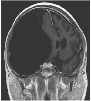 Magnetic resonance imaging of the brain revealed an arachnoid cyst, measuring 12.3 cm by 16.5 cm by 7.9 cm, with mass effect on the right cerebral hemisphere; the cyst was causing displacement of the temporal lobe superiorly and posteriorly and a shift of midline structures
