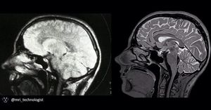 Early brain MRI scan from the 1980s (left) and nowadays high resolution 3D T2-w TSE (right) acquired at 3.0 Tesla, Siemens Prisma.