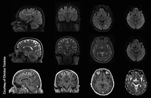High-resolution, multiparametric MR Imaging of brain metastasis (typical ring enhancing lesion), based on volumetric acquisitions (3D T2, 3D T2 FLAIR & 3D T1 post contrast are shown here) and SS-EPI DWI with b0 (not shown here), b500, b1000 and ADC map