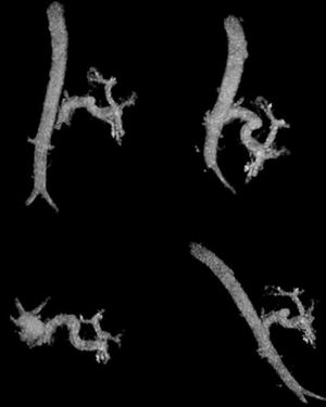 CE-MRA combines a fast T1-weighted gradient-echo acquisition with an intravenously administered paramagnetic contrast agent. Higher relaxivity gadolinium-chelate extracellular contrast agents can provide improved vascular signal-to-noise and contrast-to-noise ratios for an equimolar dose of a lower relaxivity gadolinium-chelate extracellular contrast agent. 6.7 ml of Gadobutrol (Gadovist) were used in this study. Images courtesy of Christos Tsiotsios